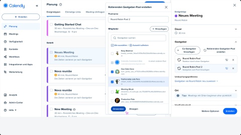 Wenn Sie unser Teams- oder Enterprise-Abo nutzen und ein erweitertes Ereignis mit mehreren Personen benötigen, können Sie unsere verbesserten Funktionen für Kollektiv und Round Robin nutzen. Richten Sie ein Ereignis mit mehreren Personen mit einer Mischung aus Gastgebern, die immer teilnehmen, und rotierenden Pools anderer Gastgeber ein.