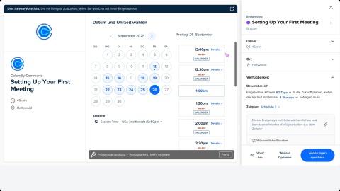 ÜBERLAPPUNG | Ein weiteres Calendly-Ereignis ist gebucht. | Planen Sie Meetings von Ihrer Meetings-Seite aus oder aktivieren Sie die Regeln für Verfügbarkeit. |