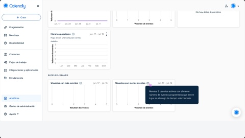 Las analíticas dentro de la aplicación de Calendly proporcionan información detallada sobre las tendencias de programación de tu organización y ayudan a los propietarios y administradores a realizar un seguimiento de los datos de hasta un año.