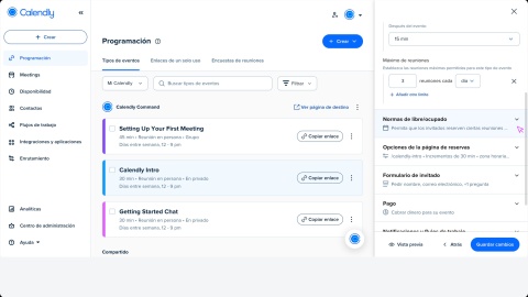 Puedes actualizar la configuración de tipo de evento en Calendly para controlar cómo y cuándo las personas pueden programar tiempo contigo.