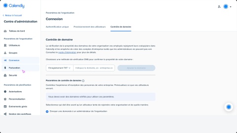 Le Centre d'administration vous permet de gérer les utilisateurs, les groupes et les paramètres de votre organisation. Vous pouvez accéder au Centre d'administration à partir du panneau latéral gauche de votre compte Calendly.