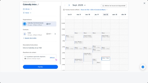 Avec Calendly, vous pouvez rapidement planifier une réunion avec votre invité lorsque vous avez convenu d'un horaire. Utilisez l'option Réserver une réunion pour planifier une réunion sans envoyer de lien.