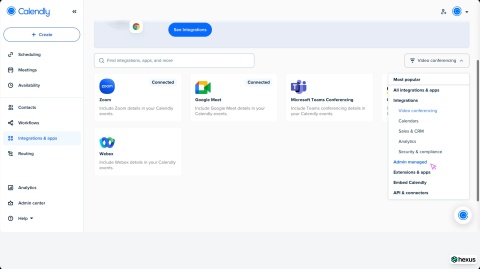 You'll notice there isn't an Admin tag on these tiles, this means your users will each need to connect their own preferred video conferencing tools from within their own account Integrations page. Feel free to send your team this article on how to schedule with video conferencing.