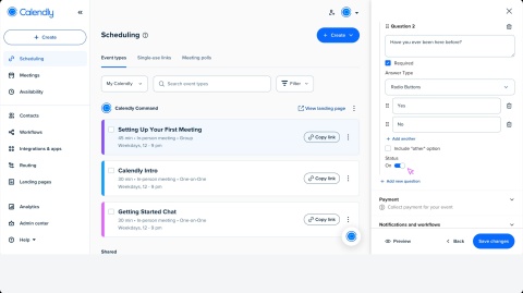 For each event type, you can add up to 10 custom questions. You can make questions optional or required. Required questions must be answered before an invitee can book. Choose the answer type that best fits the information you need.