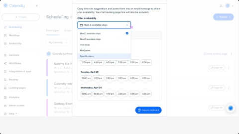Easily share your Calendly scheduling links so invitees can book time with you using landing pages, event types, and more.