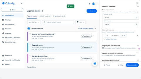 Você pode atualizar as configurações do seu tipo de evento no Calendly para controlar como e quando as pessoas podem agendar horários com você.