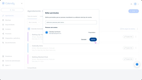 Você pode dar a outras pessoas acesso para visualizar ou editar seus tipos de eventos pessoais. Isso facilita a colaboração e o compartilhamento de links de agendamento.