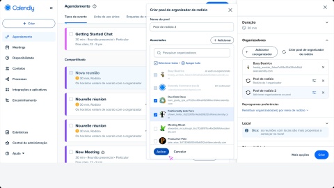 Se você está em nosso plano Teams ou Enterprise e precisa de um evento multipessoal mais avançado, pode aproveitar nossos recursos aprimorados de Coletivo e Rodízio. Defina um evento para várias pessoas com uma mistura de organizadores que sempre comparecerão e agrupamento(s) rotativo(s) de outros organizadores.